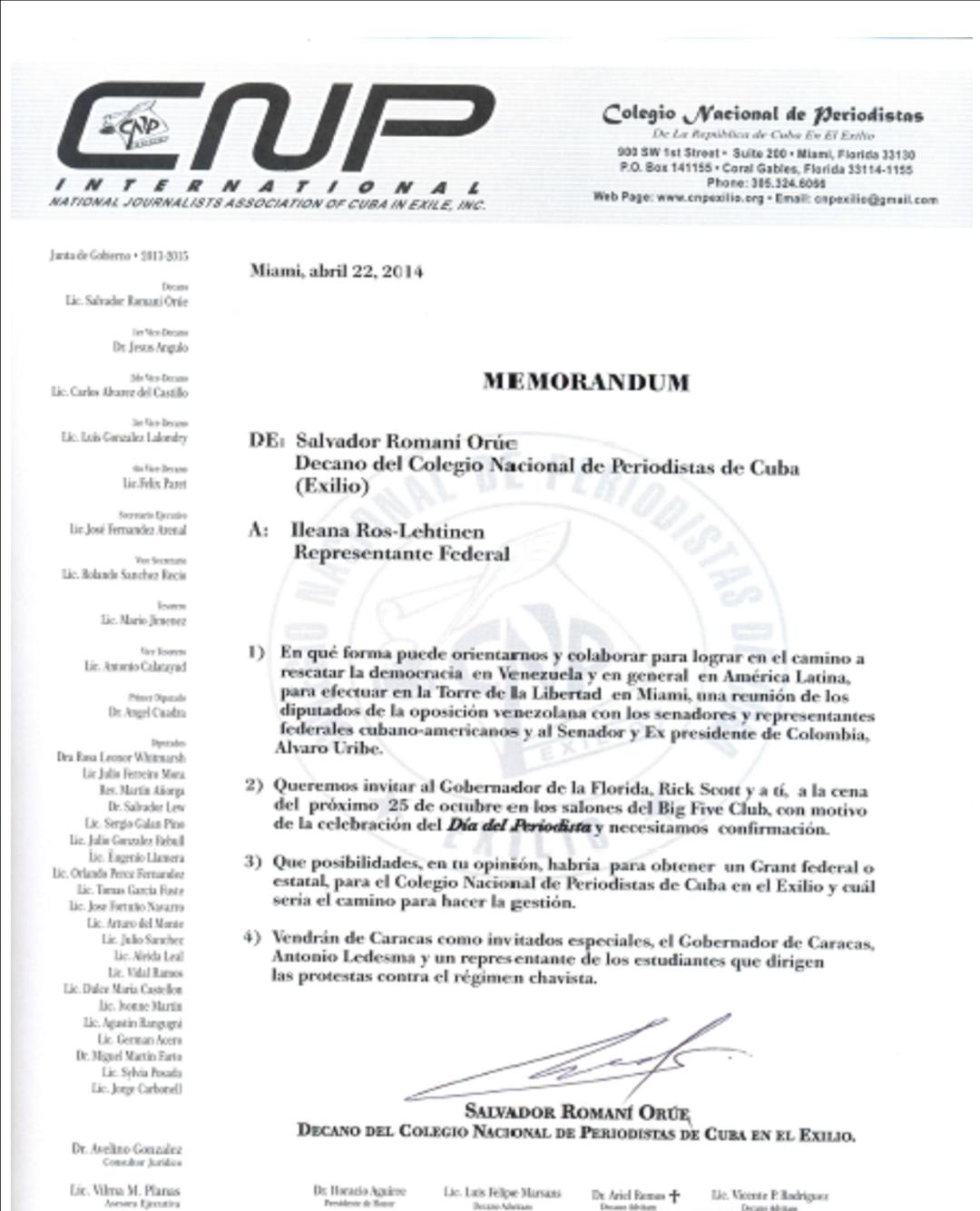-------- Original message -------- From: "Blanco Gil, Juan" Date:04/30/2014 4:01 PM (GMT-05:00) To: syposada@comcast.net Cc: "Chirinos, Zulay" ,"Montoya, Rolando" ,"Rodicio, Lenore" Subject: Nuestra entrevista de hoy Estimado Sr. Romaní: Fue un placer conocerlo y saber que pudiera existir interés de vuestra parte en establecer alguna modalidad de cooperación entre el Colegio Nacional de Periodistas y el Miami Dade College. La iniciativa que me expuso tiene gran valor y quería resumir lo que entiendo fueron nuestras conclusiones comunes: 1- El proyecto de traer a Miami a un limitado grupo de 2-5 periodistas cubanos independientes para recibir una formación profesional-informal e intensiva- por un periodo de, al menos, una semana merita buscar los apoyos necesarios para poderlo materializar. 2- El objetivo –y compromiso de los becarios- debiera ser que ellos a su vez replicarían en Cuba los talleres que hayan recibido aquí a fin de extender el beneficio de este esfuerzo al mayor número de potenciales interesados en ejercer como periodistas independientes. 3- Como ustedes no tienen suficientes recursos y nosotros no podemos disponer libremente de nuestro presupuesto para proyectos ajenos a nuestra misión publica, ambos acordamos explorar la siguiente posibilidad: a) Seleccionar los nombres de cinco candidatos b) Confeccionar un programa de principios básicos de periodismo y otras asignaturas que estimen pertinentes para impartirlas en talleres durante cinco días. El programa puede incluir actividades extra curriculares que sean complementarias a la experiencia que se desea obtengan de su visita a EEUU. c) Comprometer a un grupo de profesores -voluntarios y debidamente calificados- para impartir esos talleres. d) MDC les facilitaría gratuitamente –como coauspiciador del proyecto- un local / aula donde realizar los talleres durante cinco días (habría que escoger las fechas en que hay más disponibilidad de espacios). e) Sería bueno conocer las distintas opciones de alojamiento comercial y privado que pueden existir para que esas personas se hospeden durante una semana. f) El Colegio Nacional de Periodistas podría emitirles unos diplomas al final. Adicionalmente se intentaría continuar dándoles asesoramiento y apoyo para la encomienda de crear una escuelita de periodismo independiente a su regreso. g) Se hace necesario elaborar un presupuesto mínimo del costo de este programa para poder comenzar a gestionar donantes que lo apoyen. Le agradecería me mantuviese al día acerca de sus gestiones en este asunto. Sinceramente, Juan A BlancoGil Juan Antonio Blanco Gil (PhD) Executive Director Center for Latin American and Caribbean Initiatives Miami Dade College / Wolfson Campus 300 NE 2nd Avenue, Room 1402, Miami, Florida, 33132-2297 Phone: 1-305-237-3944 Cell Phone: 1-305-975-3248 E-mail: jblancog@mdc.edu<mailto:jblancog@mdc.edu>  |